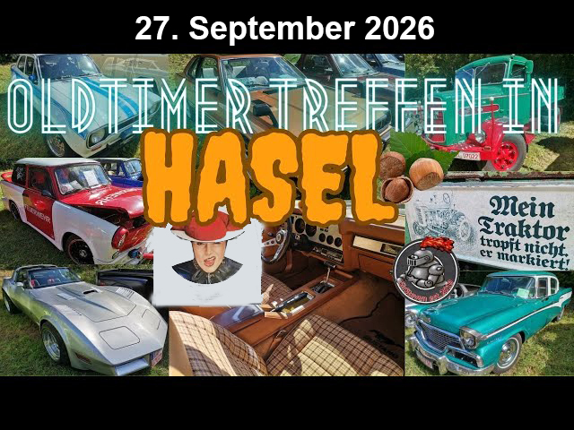 Basierend auf den vorliegenden Informationen ist das 34. Internationale Oldtimertreffen in Hasel (Südbaden, Nähe Tropfsteinhöhle) für den 27. September 2026 geplant. Flyer